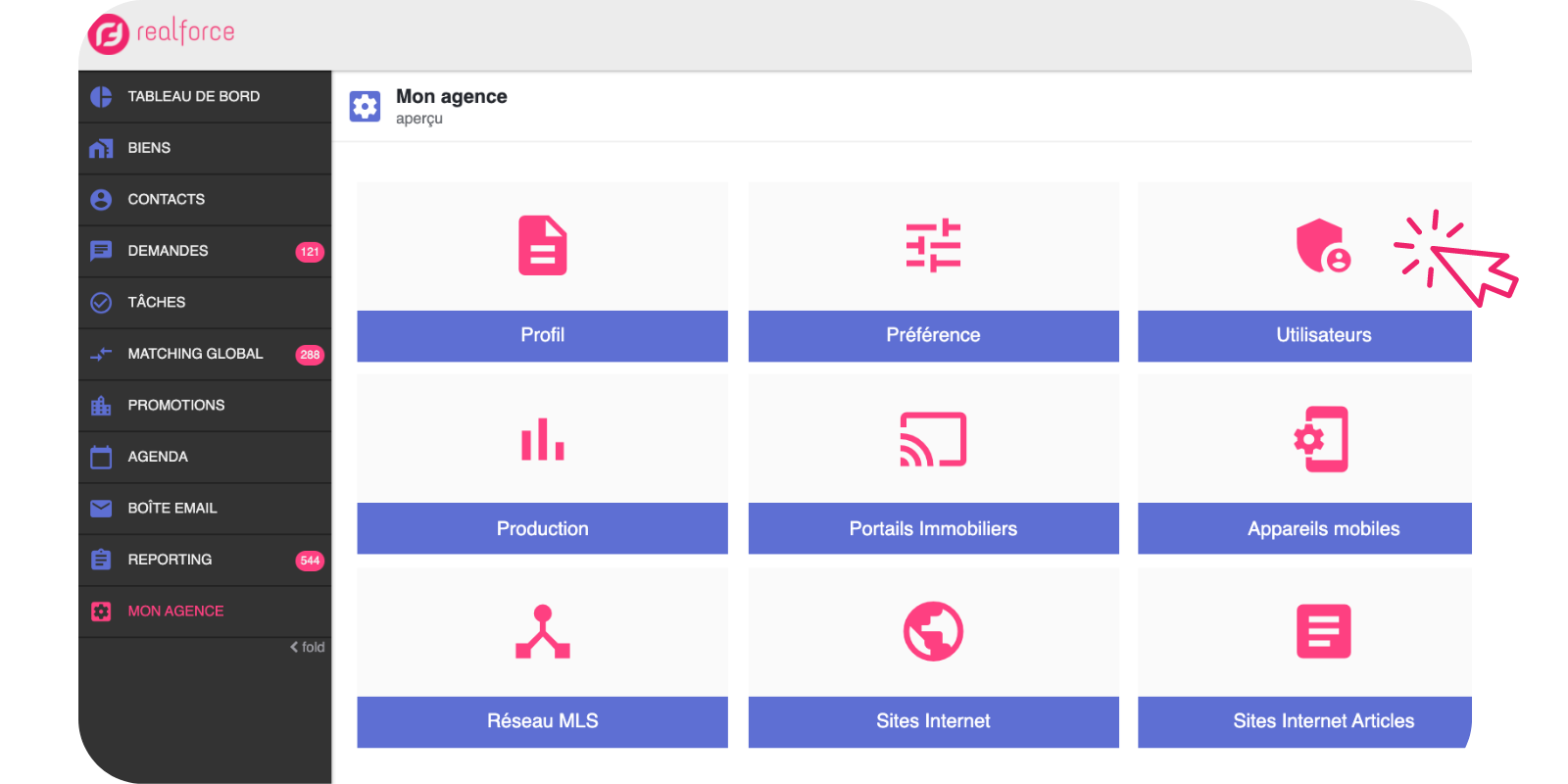 Dans le menu “mon agence” cliquez sur “Utilisateurs” puis sur le bouton vert en haut à droite de la page “Ajouter”
