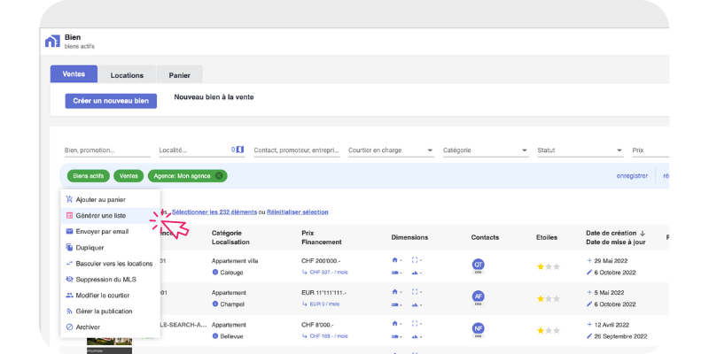 Étape 1: Cliquez sur Biens -> Biens Actifs. Recherchez et sélectionnez les biens pour lesquels vous souhaitez générer une liste.